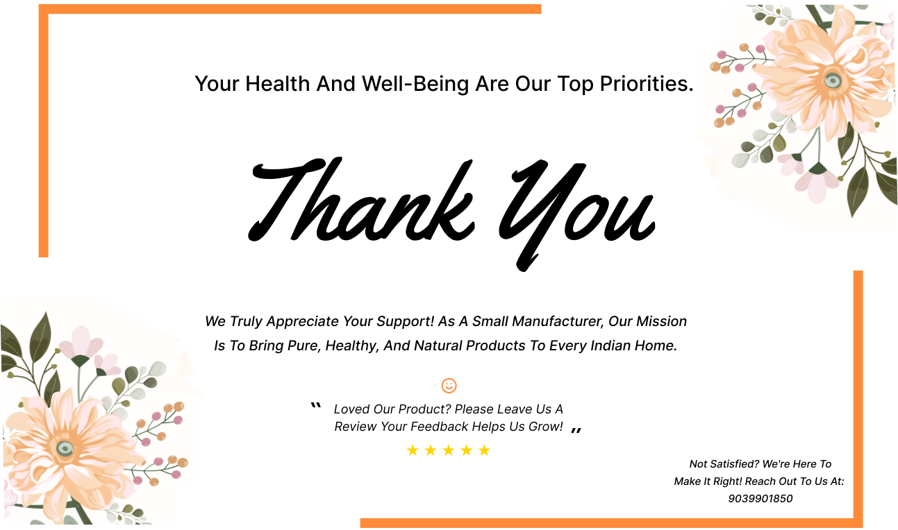 We truly appreciate your unwavering support in helping us grow! As a dedicated small-scale manufacturer, our core mission is to offer products that embody purity, health, and natural goodness, ensuring that every household in India has access to high-quality, safe, and beneficial products. We understand the importance of providing items that not only meet the needs of modern life but also promote well-being through natural ingredients, free from harmful chemicals. Our commitment is to continue delivering products that bring value to you and your family, and we are deeply grateful for the trust you place in us as we strive to make a positive impact on every Indian home.